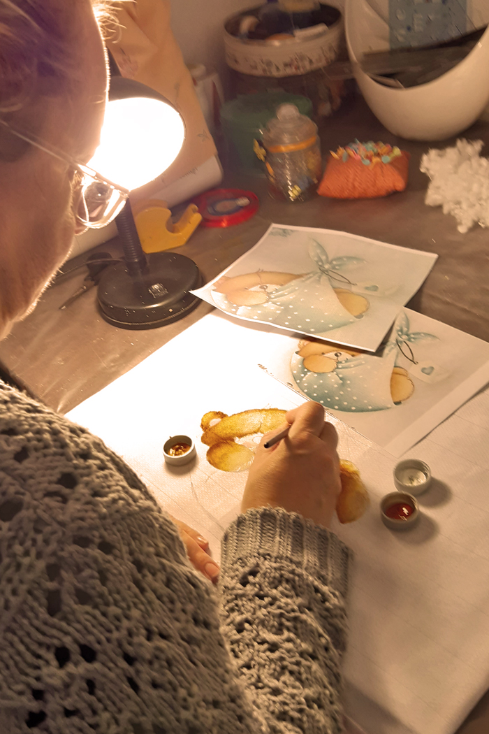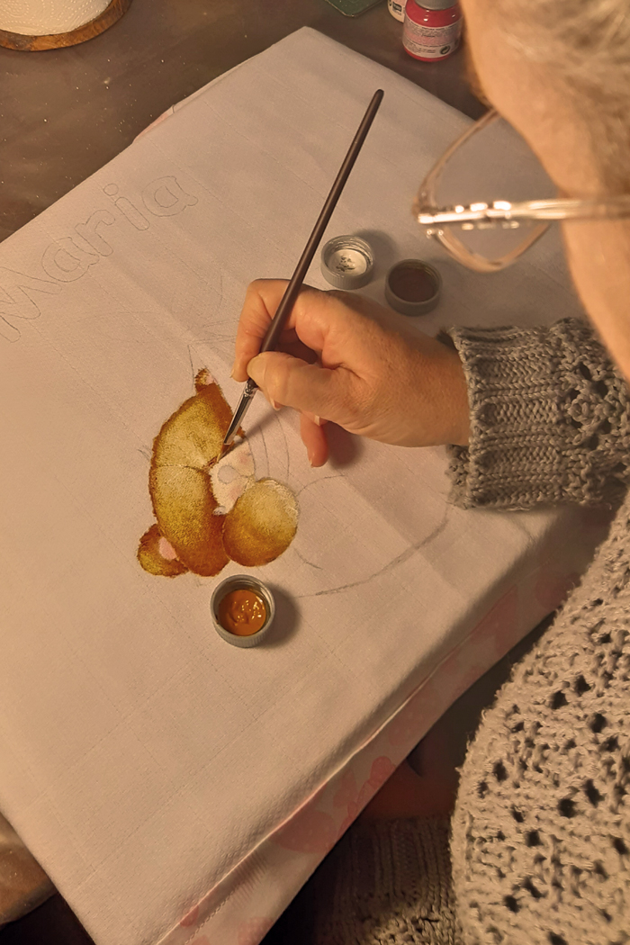 Muitos dos meus trabalhos são personalizados, essa personalização passa por trabalhar ideias apresentadas pelo cliente que depois de devidamente estudadas são executadas, passa também pela pintura de desenhos em tecido e também em tela que na sua maioria são escolhidos pelo cliente, faço também a personalização das peças com pintura do nome. Na pintura em tecido utilizo tintas específicas para tecido. As peças de madeira são decoradas e pintadas com tintas acrílicas.